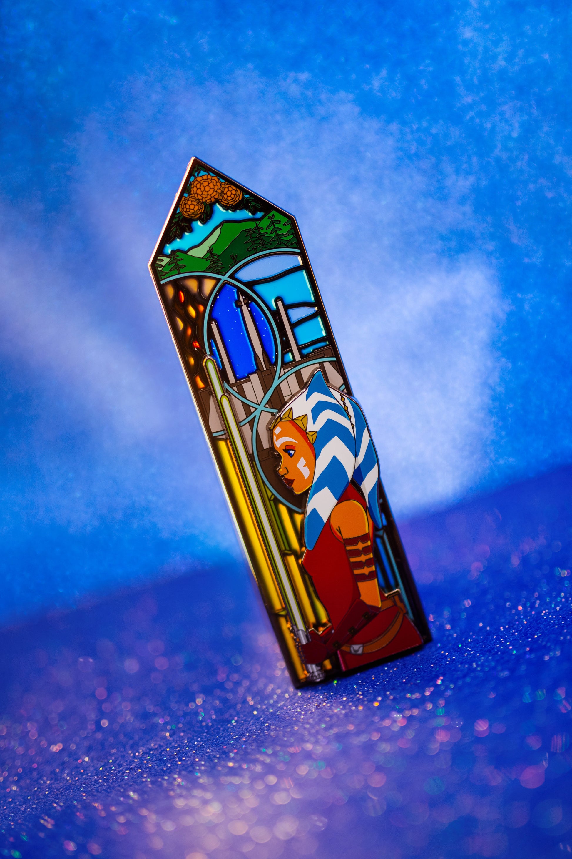 THE PIN: In the Tales of the Jedi, we saw Ahsoka grow and mature between the stun blasts of friends and soldiers. The shape of those blasts echo here to represent ripples of change, each containing different eras of the Jedi Temple as experienced by Ahsoka: dawn and a bright beginning, stars of exploration and adventure (the same stars pictured in Anakin’s window), and the fires of destruction. Though more ripples might have been included, we deliberately designed these to call to mind a Trinity knot…an inseparable bond of three. The Mentor, The Master, and the Padawan.