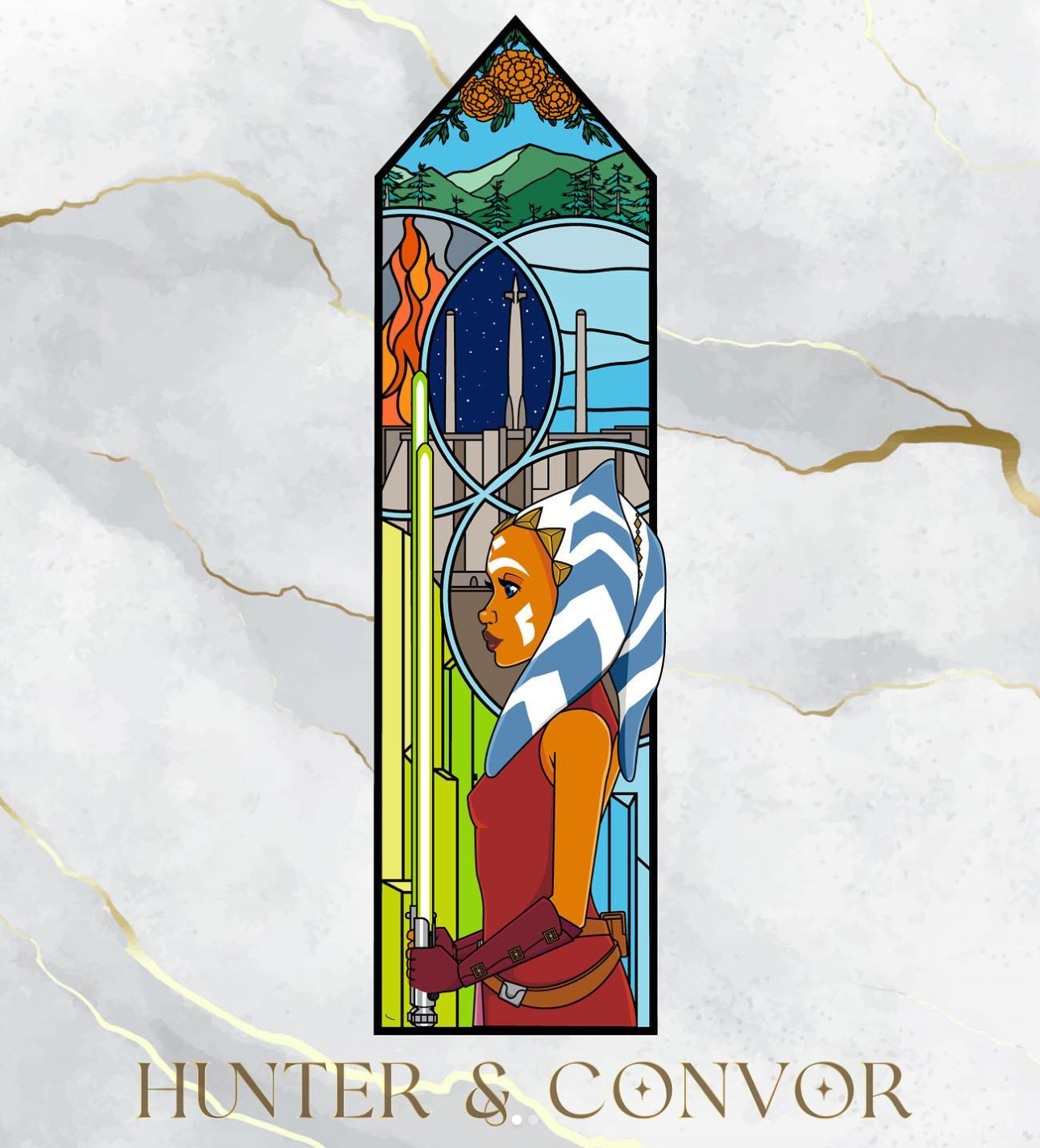 At the bottom of the window stand the crystal-like buildings of Christophsis, the planet where Ahsoka first met Anakin. Through their resemblance to kyber, we’ve pictured the transformation of Ahsoka’s sabers from green to blue. Meanwhile a garland of marigolds hangs above the mountains and forests of Shili. Owing to their resemblance to the sun, marigolds are said to represent fire, strength, and light, which might explain why in ancient times, the flowers were strung above doorways to keep out evil.